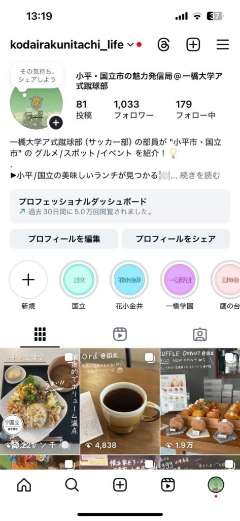 弊部のホームタウンである小平市や国立市を中心にグルメ、スポット、イベントを紹介する活動です。
